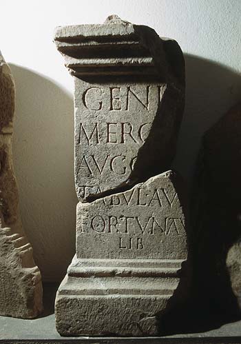 - Genio / Merc[urii] / Augg(ustorum) [lib(erti)] / tabul(arii) Au[r(elius)] / Fortunatus / lib(ertus)