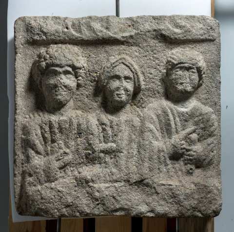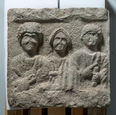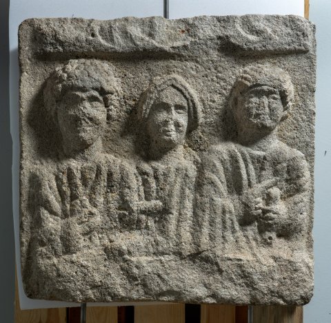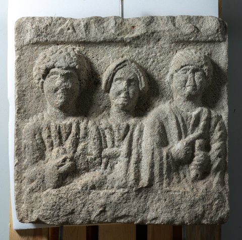 - Familie: in Rechtecknische drei Brustbilder. Links Jüngling: Locken, Tunica, Mantel. In der Mitte einheimische Frau (Mädchen ?): Haube, gegürtetes Gewand, Mantel, Rechts Knabe (Mann ?): gesträhntes Haar, Tunica, Mantel, in der Linken Rolle (volumen).