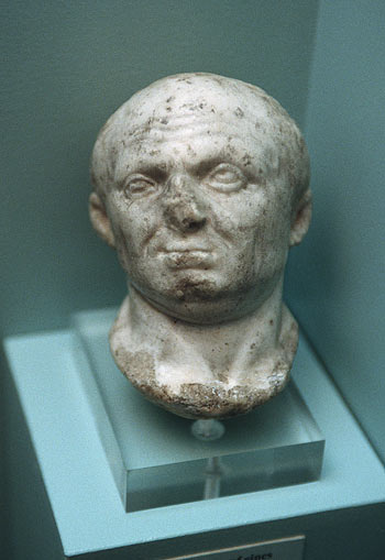 - Porträtkopf eines Mannes (Kaiser Vespasian ?): bartlos, Stirn- und Wangenfalten, Irisumriss und Pupillen angegeben.