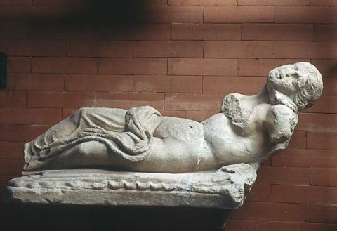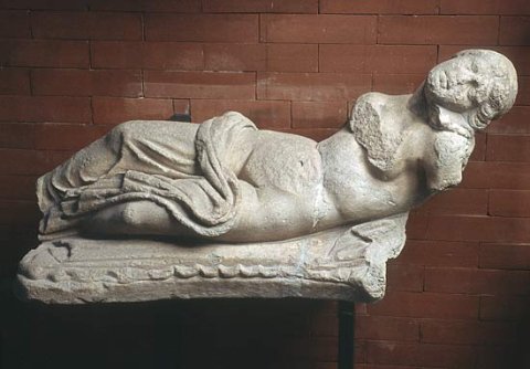 - Mythische Figur : auf flacher Basisplatte liegende Najade (Mänade ?), Mantel über die Beine gelegt, Körper entblößt, linker Arm war aufgestützt, die rechte Hand liegt auf der linken Schulter. Auf dem Plinthenrand Andeutung von Wellen ?