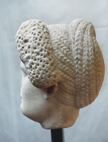 - Porträt einer Frau: breites Stirntoupet aus kleinen Locken, um den Hinterkopf aufgesteckte Flechten. Frisur der Julia Titi.