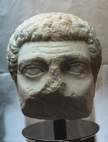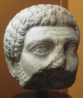 - Kopf eines Mannes : Haar und Bart kurz gelockt, Stirnfalten, Iris angegeben.