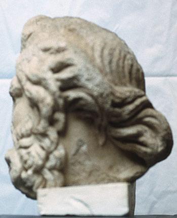 - Mythische Figur (Kentaur): Gesicht mit Alterszügen und wirr gelocktem langen Haar und Bart. Kopf war stark zu seiner rechten Seitte gedreht.