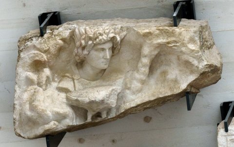 - Mythos (Mithras): in einer von Felsen gerahmten Nische Büste des Sol mit Strahlenkrone und Fackel, vor ihm Rabe (Fragment der Stiertötung - Tauroktonie).