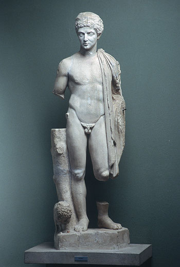 - Mythische Figur: auf unregelmäßig eckiger Plinthe mit Baumstammstütze stehender Mercur (Hermes), nackt bis auf Mantel über linker Schulter und linkem Arm. In der Linken Caduceus (Kerykeion), flache Flügelkappe auf dem Kopf mit kurzen Locken, neben dem rechten Fuß Widder.