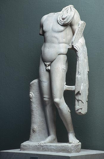 - Mythische Figur (Dioskur): auf viereckiger Plinthe mit Baumstammstütze stehender nackter Jüngling, Mantel auf linker Schulter und um linken Arm, in der linken Armbeuge Schwert.