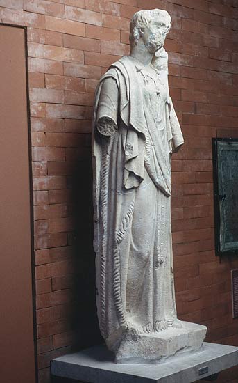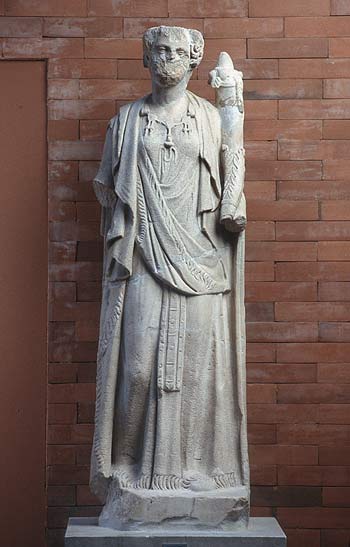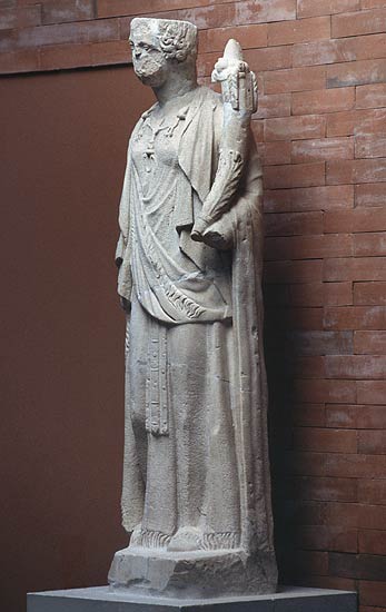 - Mythische Figur (Isis-Noreia): auf viereckiger Plinthe stehende Göttin im Peplos mit Überschlag, der zur rechten Schulter hinaufgeschlagen ist. Säume mit Fransen besetzt. Vorn wird das Ende des breiten, beschlagenen Gürtels sichtbar. Mantel über Rücken und beide Schultern gelegt. Brustschmuck mit drei Anhängern, Schuhe, im linken Arm mit Blättern umhülltes Füllhorn.