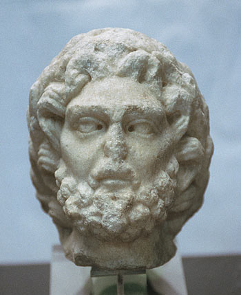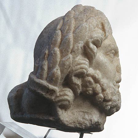- Mythische Figur (Jupiter): Kopf mit Bart aus Buckellocken, langes gewelltes Haar, dicker Lorbeerkranz, rückwärts von Band zusammengefasst.