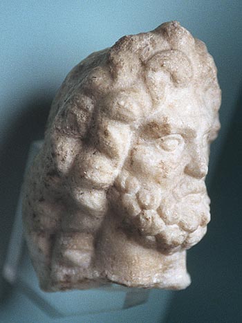 - Mythische Figur: Jupiterkopf mit langem gelockten Haar, kurzem Vollbart aus Buckellocken