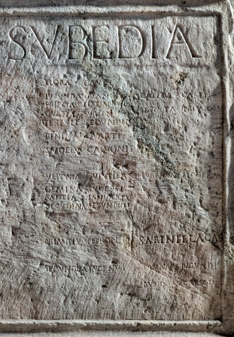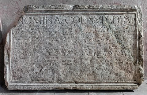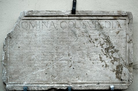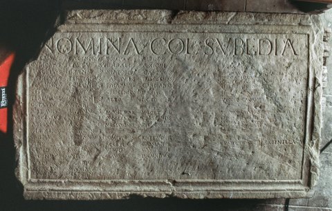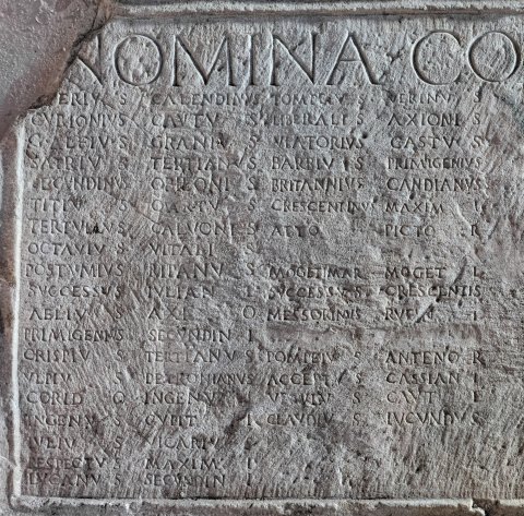 - Nomina col(legiatorum) sub(a)edia(norum) // Aterius Calendinus / Curionius Cautus / C(aius) Alfius Granius / Satrius Tertianus / Secundinus Obilonis / Titius Quartus / Tertullus Calvonis / Octavius Vitalis / Postumius Ripanus / Successus Iuliani / Aelius Axio / Primigenius Secundini / Crispius Tertianus / Ulpius Petronianus / Corido Ingenui / Ingenu(u)s Cupiti / Iulius Vicarius / Respectus Maximi / Lucanius Secundini // Pompeius Verinus / Liberalis Axionis / Viatorius Castus / Barbius Primigenius / Britannius Candianus / Crescentinus Maximi / Atto(nius) Pictor / Mogetimar(us?) Mogeti / Successus Crescentis / Messorinus Rufini / Pompeius Antenor / Acceptus Cassiani / Ursulus Cauti / Claudius Iucundus // Flora Cauti / Iucunda Grani / Priscia Tertiani / Quinta Surioni(s) / Tertull(a) Secundini / Beni(g)na Quarti / Sucelu(!) Calvonis / Veponia Quintilla / Gemina Successi / Rantia Ianuaria / Secu(n)dina Secundini / Primitiu(!) Petroniani / Secundina Ingenui // Calida Casti / Res(ti)tuta Primigen(i?) / Ingenua Mogetim(ari?) / Sabinilla Cas() / Sabina Iucundi / Dubitata Crescent(is)