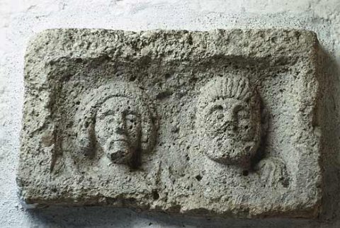 - In Rechtecknische Ehepaar (Köpfe und Schultern erhalten). Links einheimische Frau: Haube, Doppelknopffibeln. Rechts Mann: bärtig, gesträhntes Haar.
