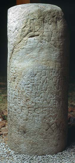 - Imp(erator) Caesar M(arcus) / [Op]ellius Sev[e]ru(s) / [Mac]ri[nus P(ius)] F(elix) A[u]g(ustus) / pont(ifex) m[a]x(imus) trib(unicia) / potestati(!) II p(ater) p(atriae) co(n)s(ul) / proco(n)s(ul) et M(arcus) Opell(i)us / Diadumenianus / nobilissimus Caes(ar) / princeps iuventutis / Augg(usti) fecerunt /a Viruni(!) m(ilia) p(assuum) / XV