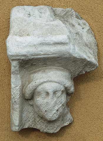 - In tiefer Rechtecknische mit profilierter oberer Rahmenleiste Kopf einer einheimischen Frau mit Haube. Rest einer Grabstele ?