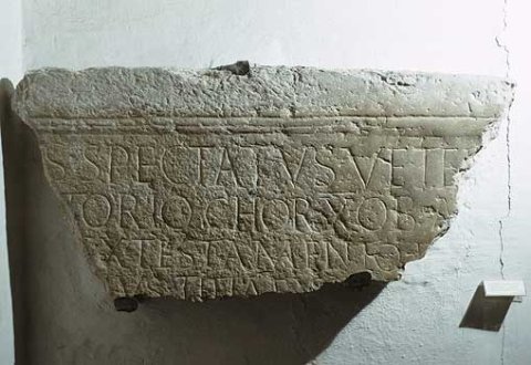 - [---]s Spectatus veter[anus] / [ex prae]torio c(o)hor(tis) X ob(itus) a[nnor(um) ---] / [---] ex testamento f[---] / [coniux e]ius Titia Exora[ta ---] / [------]