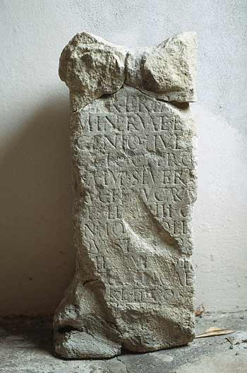 - [C]ereri Aug(ustae) / Minervae e[t] / Genio hui[us]/ce loci pro / sal(ute) Imp(eratoris) Severi / Aug(usti) Fl(avius) Mucatra / [t]es(serarius) leg(ionis) [X]IIII G(eminae) / [i]n ho[n(orem) c]oll(egii) / quaest[or p]os(uit) / [I]mp(eratore) [Se]ve[r]o II / [[[Cl(odio)] A[l]b[i]n(o)]] Cae/[sa]re II co(n)s(ulibus)