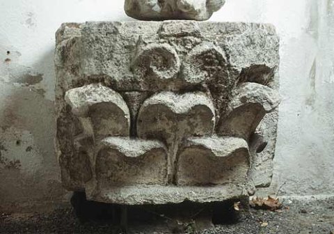 - Kapitell mit zwei Blattkränzen, darüber Reste von Volutenstängeln, hinten Ansatz eines Wandquaders