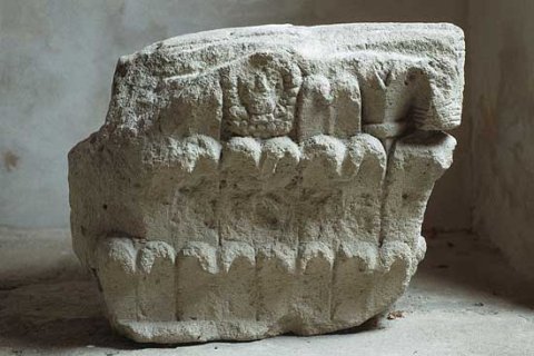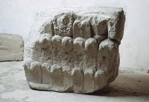 - Kapitell: drei übereinander gestaffelte Blattreihen, im Zentrum der obersten Gesicht.