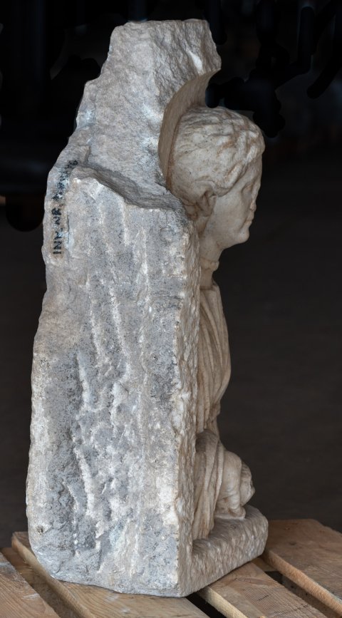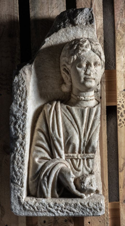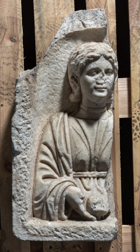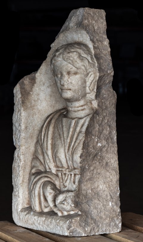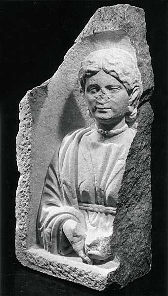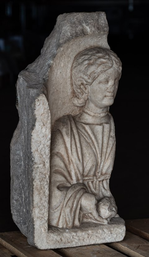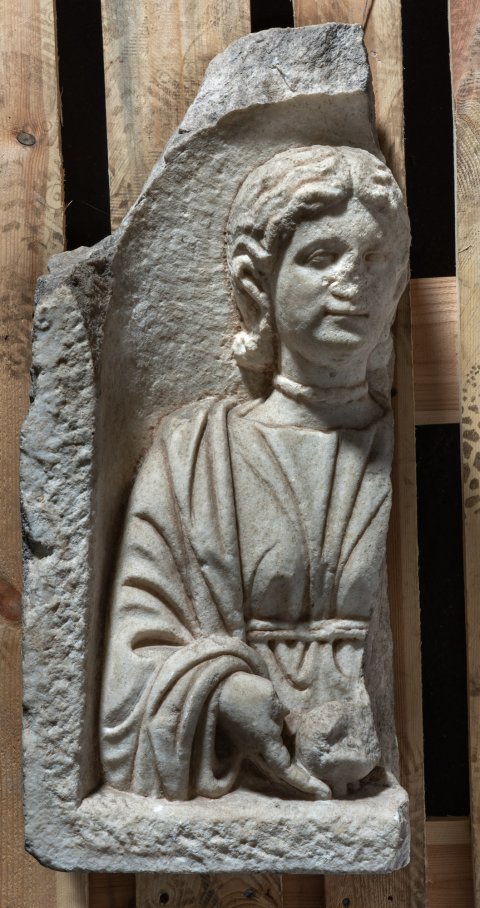 - Halbfigur einer Frau: gewelltes, in der Mitte gescheiteltes Haar (Frisur der Fausta ?), Ohrringe, Halskette, doppelter Schnurgürtel mit eckiger Schließe, Umhang, in der Rechten Apfel. Rechts schloss(en) weitere Person(en) an.
