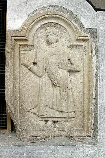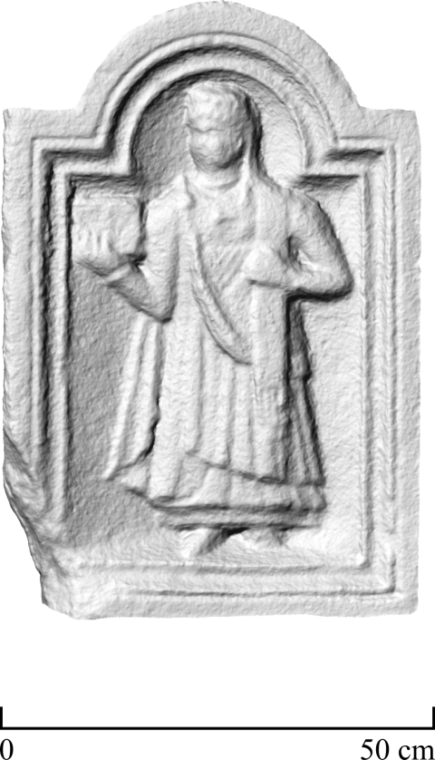 - Dienerin: einheimisches Mädchen in Unter - und Obergewand, Umhang, Fibeln, Armreifen, in der Rechten Kästchen, über der linken Schulter mappa. Bildfeld mit profiliertem Rahmen, oben bogenförmig abgeschlossen.