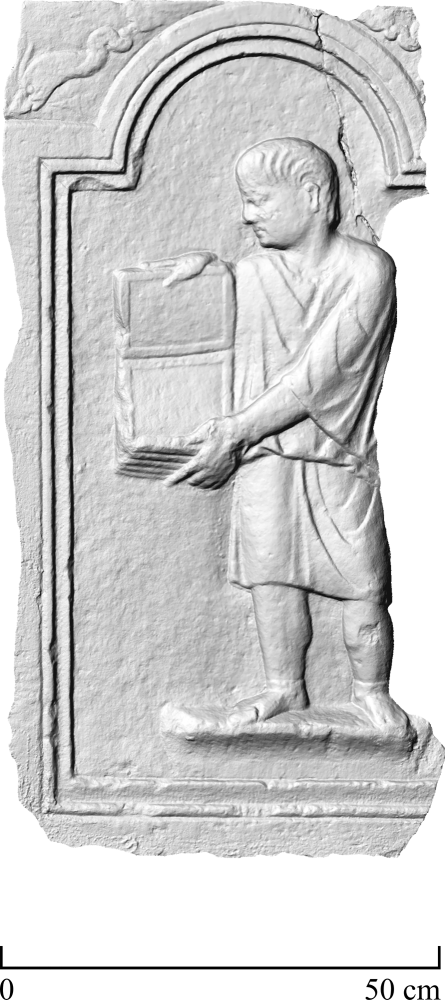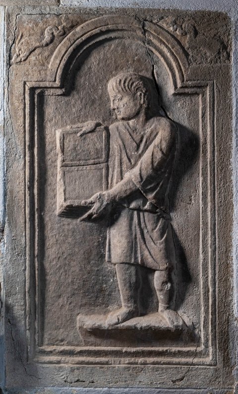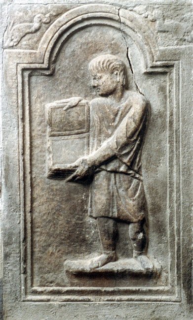 - Diener (Librarius - Scriba) : in Bogenfeld auf flachem Podest Mann in kurzer Tunica, in den Händen offenes Polyptychon. Seitlich des Bogens je ein Delphin.