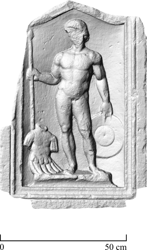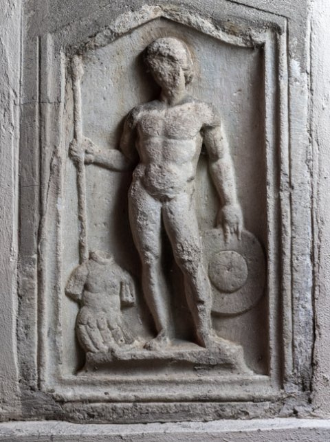 - Mythische Figur (Mars, Heros ?). In Giebelnische auf flachem Podest nackter Jüngling mit Waffen: in der Rechten Lanze, in der Linken Rundschild, neben dem rechten Bein Panzer mit Pteryges und Streifenschurz.