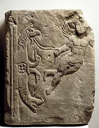 5918 Fliegender Genius und Peltenhenkel einer Schrifttafel