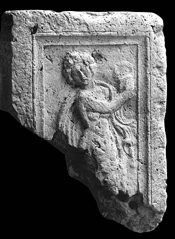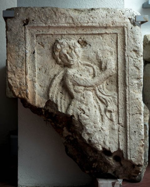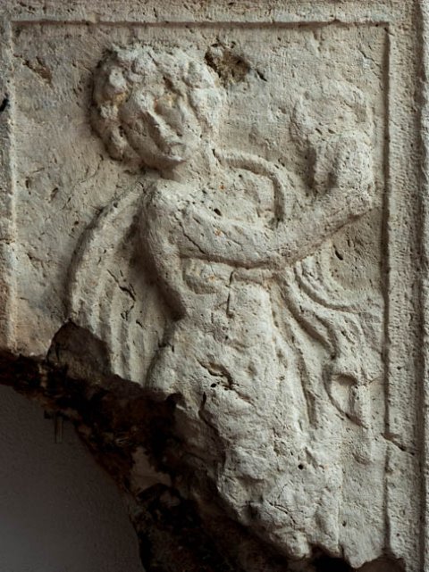 - Mythische Figur, Musikinstrument: in gerahmtem Rechteckfeld tanzende nackte Mänade mit Blätterkranz, Mantel um linke Schulter und Rücken, in den Händen Schallbecken (Kymbala).