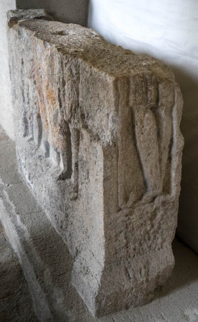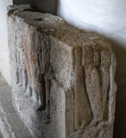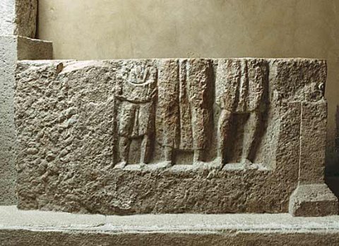 Auf der vorderen, pfeilerartigen Schmalseite mythische Figur : Attis in kurzer Tunica, überkreuzte Füße, Hirtenstab (Pedum).