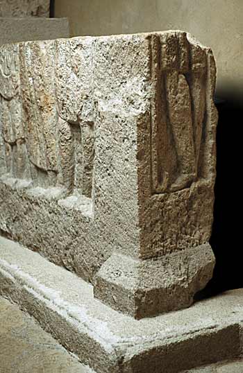 Auf der Längsseite Diener (Librarius - Scriba): in leicht vertieftem Rechteckfeld links Mann in kurzer Tunica mit geöffneter Rolle (volumen), in der Mitte Mann in wadenlanger Tunica, rechts Mann in kurzer Tunica.