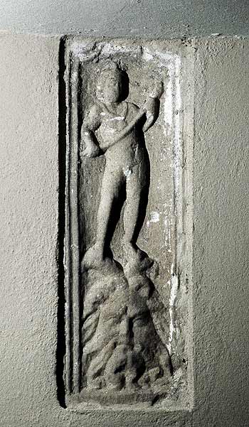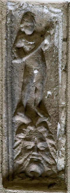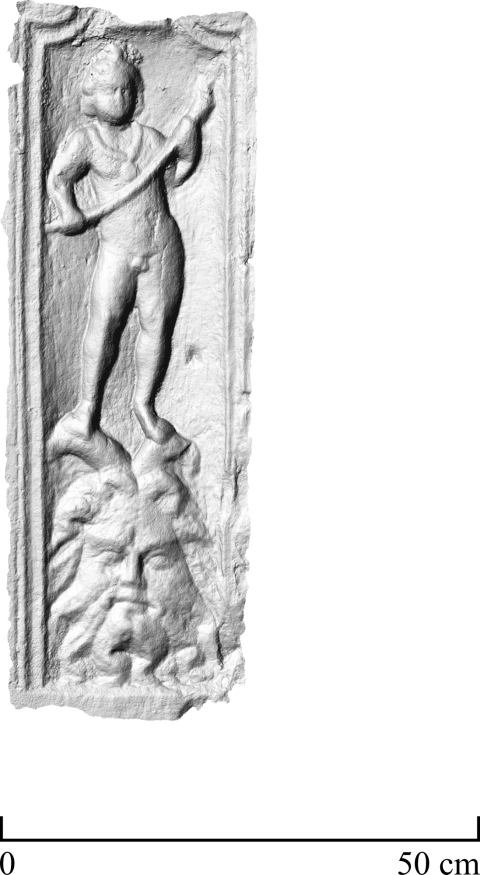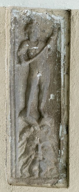 - Über bärtigem gehörnten Kopf (Flussgott ?) stehender nackter geflügelter Knabe (Genius, Erot), Halsband mit Bulla, in den Händen Fackel. Rahmen oben geschwungen mit Volutenenden.