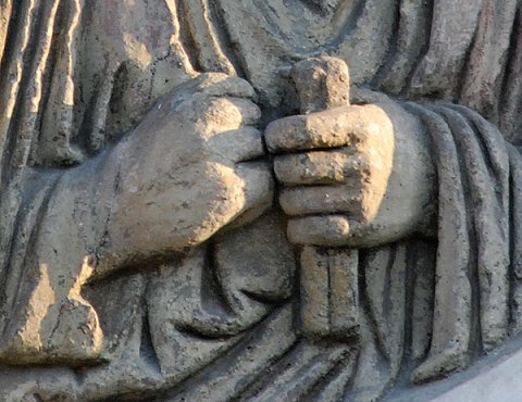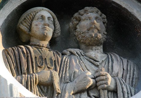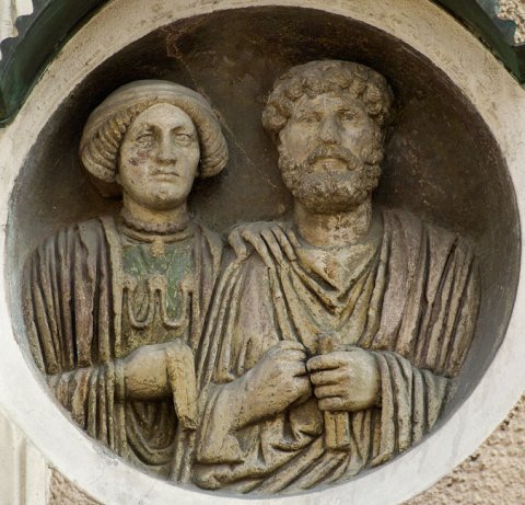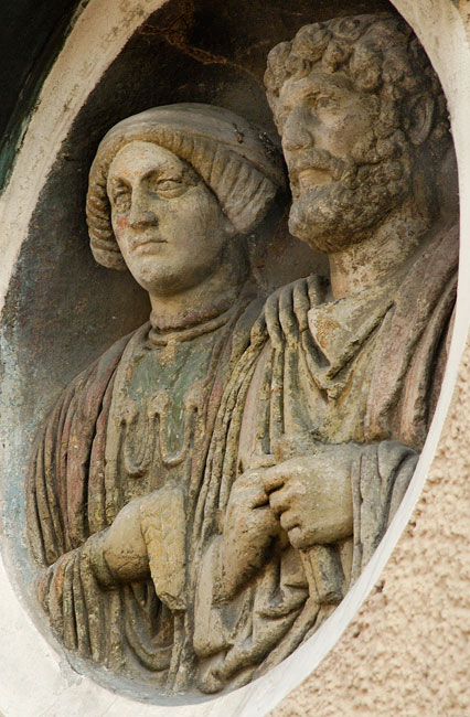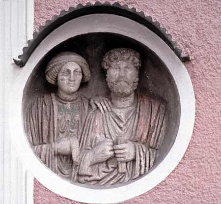 - Ehepaar. In Kranzrahmen Halbfiguren, links einheimische Frau: Haube, Umhang, Fibeln, Brustschmuck mit Peltenfibeln, Halsband, Halsreif mit Lunula, in der Rechten breites Band. Rechts Mann: bärtig, Locken, Ärmeltunica, Toga, in der Linken Rolle (volumen).