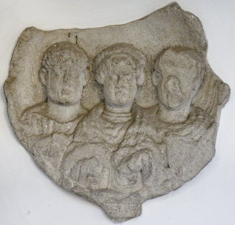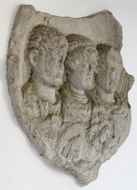 - Drei Brustbilder einer Familie. Links Mann. bärtig, Tunica. In der Mitte Frau: aufgesteckte Zopffrisur, Mantel, zwei Halsreifen. Rechts Mann: bartlos, Sagum (?).