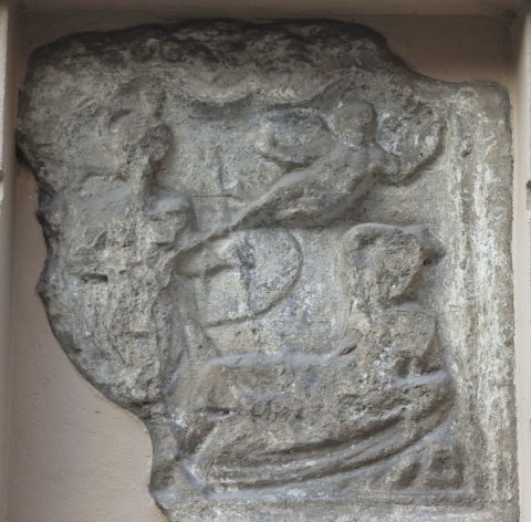 - Mythos : gerahmtes Bildfeld mit geschwungenem oberen Rahmen, rechts schlafende Rhea Silvia, über ihr fliegender Eros, von links kommender Mars mit Helm, Schild, Lanze.