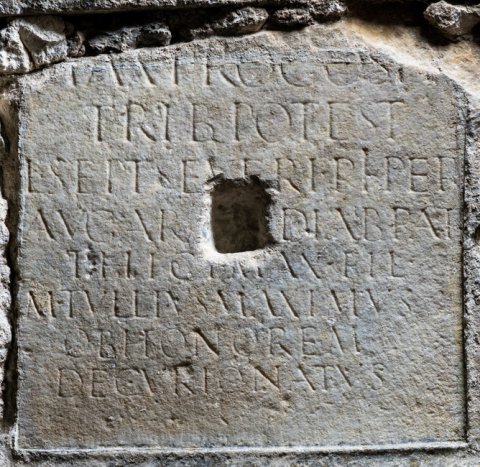 - [Imp(eratori) Caes(ari) M(arco)] / [Aur(elio) Antoni]/[no Aug(usto) P(io) pont(ifici)] / max(imo) proco(n)s(uli) p(atri) p(atriae) / trib(unicia) potest(ate) / L(uci) Sept(imi) Severi Pi(i) Per(tinacis) / Aug(usti) Ara[b(ici) A]diab(enici) Par/thici max(imi) fil(io) / M(arcus) Tullius Maximus / ob honorem / decurionatus