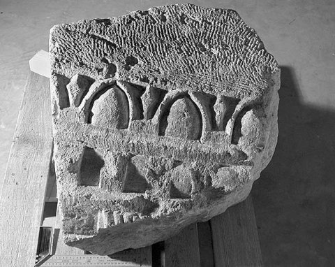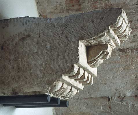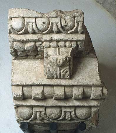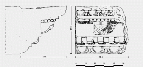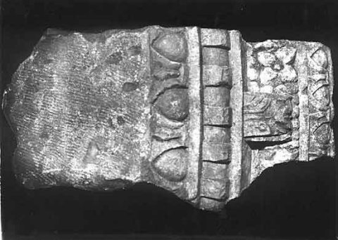 - Gesimsblock von der Apsis des Tempels I (sog. Isis-Noreia Tempel), links originale Anschlussfläche mit Zahneisenglättung, rechts gebrochen, mit der Rückseite heute eingemauert, Oberseite grob gepickt.