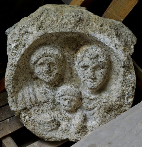 - Familie: Brustbilder eines Ehepaares mit Kind. Links Frau: severische Frisur, Mantel. Rechts Mann: bärtig, Sagum, in der Linken Rolle (volumen)?. Vorn Knabe.