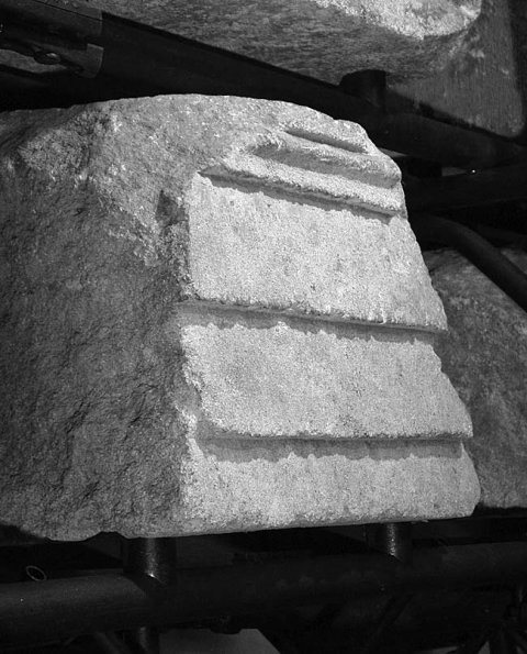 - Dreifascienarchitrav. Unterseite (Soffitte): vegetabiles Ornament (breites von Kyma gerahmtes Soffittenfeld mit zwei sich kreuzenden Weinranken).