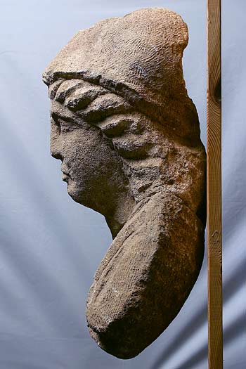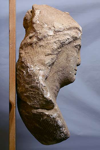 - Mythische Figur (Mars Latobius ?): Die in zwei Teile gebrochene Büste ist gut erhalten, nur der Helm und die rechte Schulter sind bestoßen; der Jüngling trägt einen in den Nacken geschobenen korinthischen Helm, über der linken Schulter befindet sich der Mantelbausch. Die Rückseite ist gewölbt, der weit vorgeneigte Kopf war offenbar auf starke Unteransicht konzipiert.