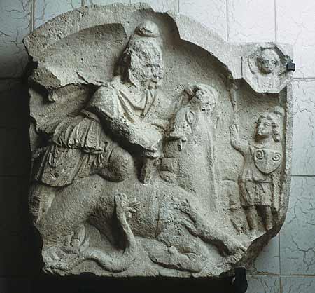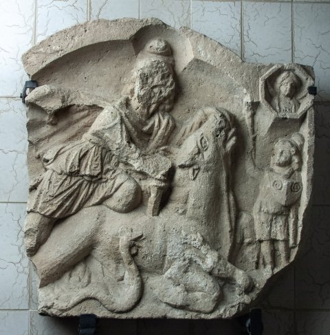 - Mythos (Mithras): in Bogennische Stiertötung (Tauroktonie) mit Skorpion, Schlange und Hund, rechts oben achteckiges Medaillon mit Büste der Luna, darunter Cautes.