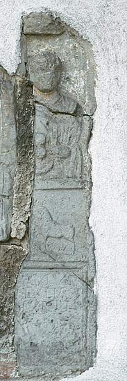 Im Hauptbild Mann (Familie ?): in Rechtecknische rechts Brustbild eines Mannes, vor ihm Reste eines Kindes (?).