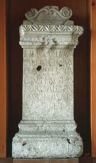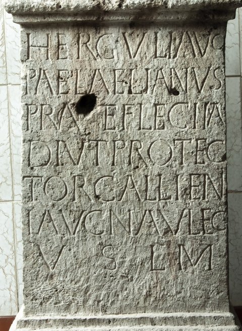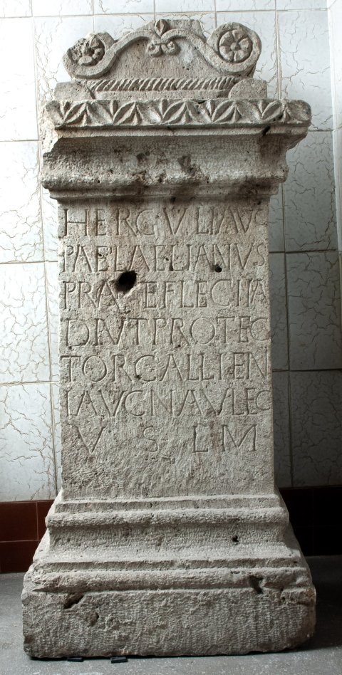 - Herculi Aug(usto) / P(ublius) Ael(ius) Aelianus / praef(ectus) leg(ionis) II a/diut(ricis) protec/tor Gallien/i Aug(usti) n(ostri) a(gens) v(ices) leg(ati) / v(otum) s(olvit) l(ibens) m(erito)