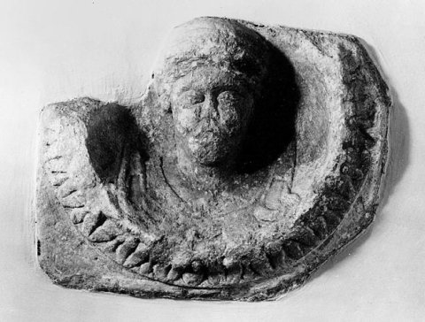 - Medaillon mit lesbischem Kymation gerahmt, darin Büste einer einheimischen Frau mit Haube, Unter- und Obergewand, Flügelfibeln.