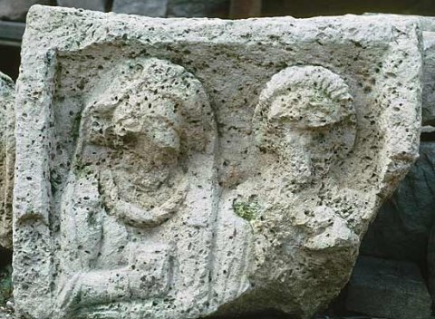 - In Rechtecknische zwei Brustbilder (Ehepaar). Links einheimische Frau: Haube, Schleier, Fibeln, Torques, Armband, in der Linken Attribut. Rechts Mann: gesträhntes, nach vorn gekämmtes Haar.