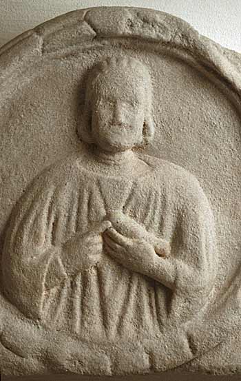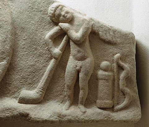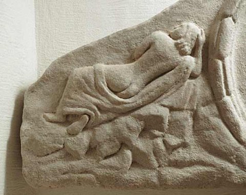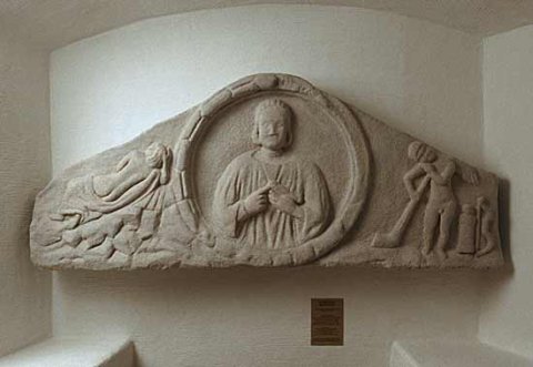 - Mädchen, mythische Figuren: im Zentrum des Giebelfeldes Medaillon mit Kranzrahmung, darin weibliche Halbfigur: Haarbausch hinter den Ohren, Ärmeltunica, zwei Halsreifen, Armbänder, in der Linken Vogel. Links auf Felsen gelagerte Nymphe mit entblößtem Rücken, Kopf in die Rechte gestützt. Rechts nackter geflügelter Trauergenius (Erot) mit gesenkter Fackel, neben ihm Köcher und Bogen.
