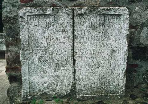 - Imperatores Caesares dd(omini) nn(ostri) / Valentinianus [e]t Valens fratres / concordissimi victores maximi / ac triumphatores [s]emperque Augusti / muros cum turribus horum cas/trorum a rudimentis fundamento/rum consurgere imperarunt dispo/nente Equitio v(iro) c(larissimo) comite mag(istro) equitum / peditumque cur[a]nte Augustiano / [[v(iro) c(larissimo) comite ord(inis)]] pr[i]mi et duce Val(eriae) limitis / numini clementi(a)eq[u]e eorum dicatissimis