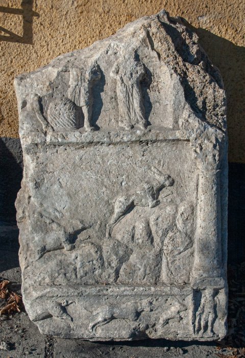 Zwischenfries mit Tieren: Hund jagt Hasen nach rechts, nach links laufendes Wildschwein. Am rechten Rand kleines Rechteckfeld mit Trauergenius mit gesenkter Fackel.