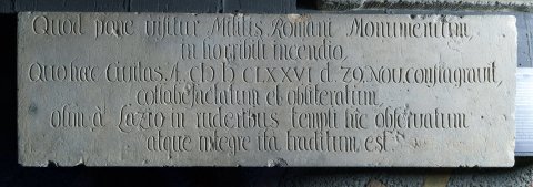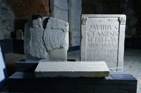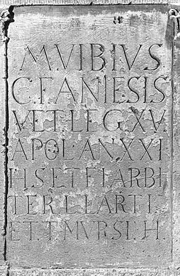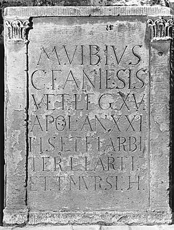 - M(arcus) Vibius / C(ai) f(ilius) Anie(n)sis / vet(eranus) leg(ionis) XV / Apol(linaris) an(norum) LXXI(?) / h(ic) s(itus) e(st) t(estamento) f(ieri) i(ussit) arbi/ter(!) L(uci) Larti / et T(iti) Mursi h(eredum)