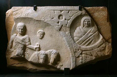 - Mythische Figurn, Jahreszeiten: rechteckige Platte mit zentralem Medaillon, darin Jüngling auf zweispännigem Wagen, nackt bis auf Sagum mit Scheibenfibel. Über den Pferden weibliches Gesicht (Luna). Im erhaltenen rechten oberen Eck Medaillon mit Brustbild des Winters: bärtig, Mantel, Kapuze. Darunter Korb mit Früchten.