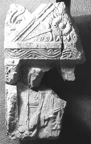 Im Hauptbild Familie : zwischen Säulen Reste von zwei Halbfiguren (weitere Figur rechts ist verloren).Links Frau in hochgegürtetem Gewand und Mantel. In der Mitte Mann in Ärmeltunica und Sagum, in der Linken Rolle (volumen). Auf der oberen Rahmenleiste Wellenornament.