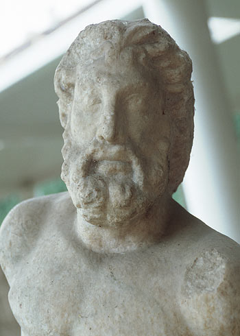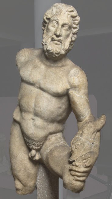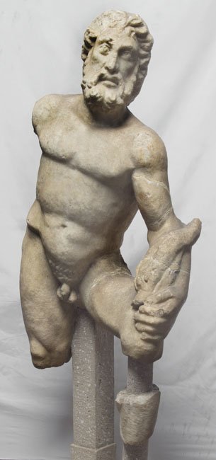 - Mythische Figur (Poseidon - Neptun): nackte Figur mit hochgestelltem linken Fuß, linke Hand umfasst das linke Knie, auf dem Unterarm Delphin. (Rechter Arm war erhoben und auf Dreizack gestützt).